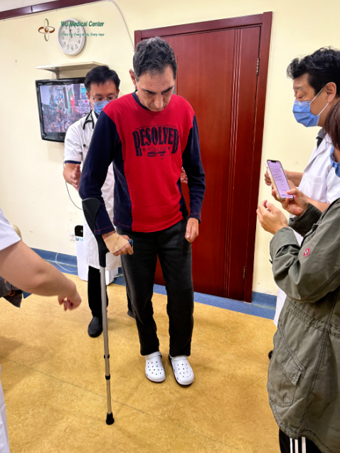 The patient's motor function is significantly improved, with an overall enhancement of about 30%, and the progression of the disease is halted. His respiratory function is improved, his speaking volume is increased, and episodes of interruption is decreased. Limb strength is improved, with proximal muscle strength in both upper limbs reaching approximately grade 4, allowing him to counter considerable resistance. His left hand grip strength is at grade 3, enabling him to grasp another person's fingers, and at a specific angle, he can pinch a reflex hammer between two fingers; his right hand grip strength reaches grade 4+. His lower limb strength is improved to grade 4; in a supine position, he can maintain a right angle in hip flexion and knee flexion in his left lower limb for over 10 seconds, and for his right lower limb, it is 13 seconds. The stiffness in his hip joints is significantly decreased, and the spasms and pain are disappeared. His range of motion is improved, as he can open his legs to approximately a 60-degree angle without discomfort. The speed and stability of the knee-heel-tapping test are increased compared to before. He requires less support while walking, his walking speed is increased, turning becomes noticeably more flexible, and his stability is improved. His energy levels, physical fitness, and exercise endurance also are increased.