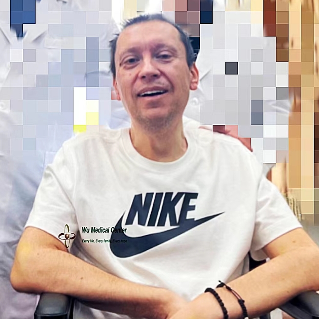 After treatment, the patient's motor function improved significantly, with his limb muscle strength increasing by 30%. His left upper limb, which could not lift off the bed before admission, now has muscle strength of grade 4- and can lift his arm above the bed by more than 15 cm. His left hand has a grip strength of grade 4-. His right upper limb has muscle strength of grade 3+ and can lift his arm above the bed by 10 cm. His right hand has a grip strength of grade 3+. His flexibility and mobility have significantly improved, along with his grasping ability and hand function, allowing him to hold a cup and use a walker. His lower limbs have muscle strength of grade 4 and can walk with the assistance of a walker. His left fingers can now complete the finger-to-nose test, while his both lower limbs can complete the heel-knee-shin test. The pain in his right ribs has significantly improved as well. His energy, physical stamina, and endurance have all improved significantly.
